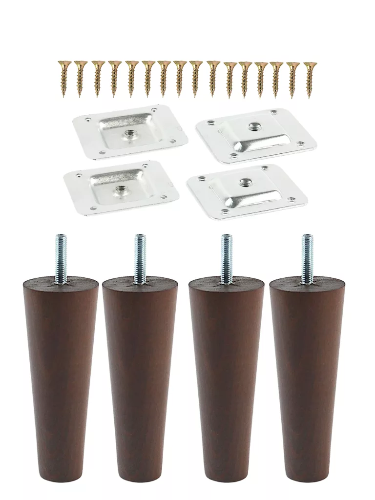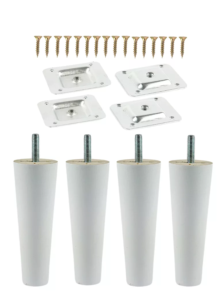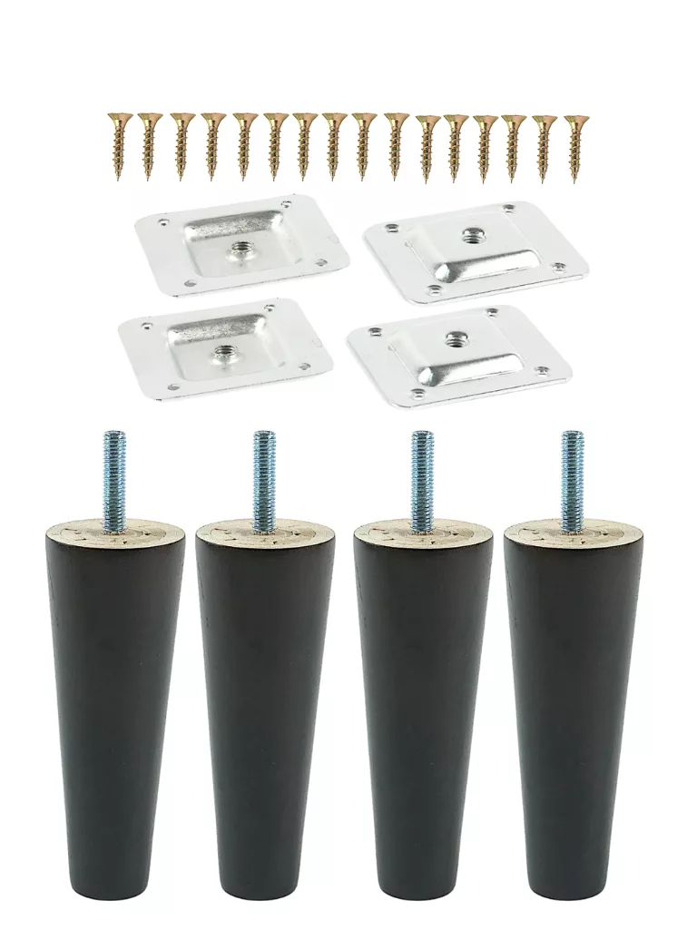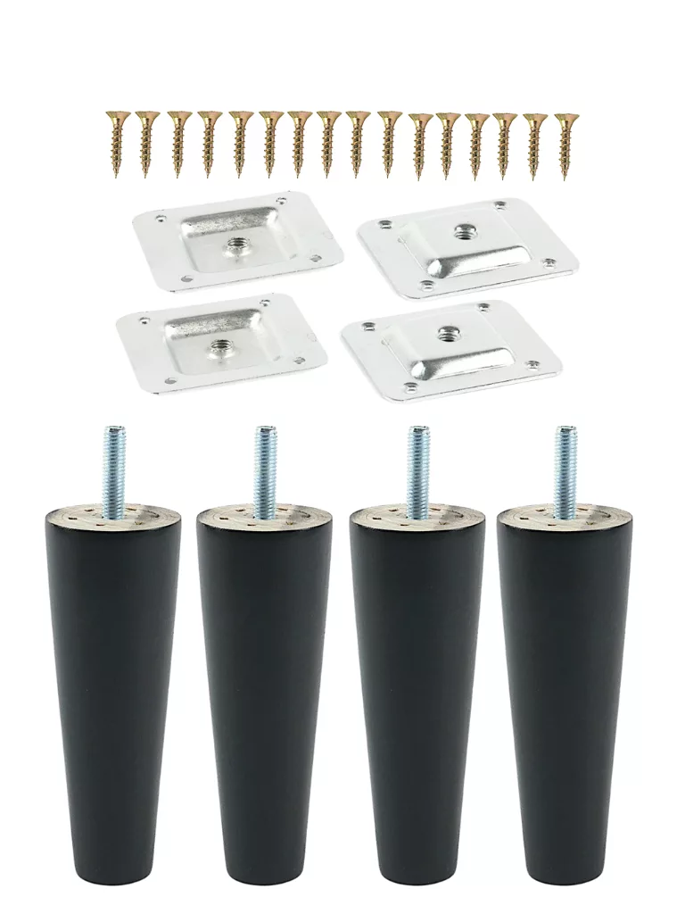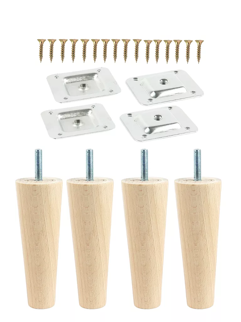 Zestaw czterech stożkowych nóg drewnianych do mebli o wysokości 13 cm to kompletne rozwiązanie, które ułatwia stabilny montaż mebli tapicerowanych, stolików czy szafek. Dzięki dołączonym blachom montażowym i wkrętom, cały proces instalacji przebiega szybko, a wszystkie potrzebne części zebrane są w jednym zestawie! Nogi dostępne są w pięciu wariantach kolorystycznych – naturalny, biały, brązowy, wenge i czarny, co pozwala dopasować je do różnych stylów wnętrz. To funkcjonalny i estetyczny zestaw, który podnosi walory użytkowe oraz wizualne mebla.