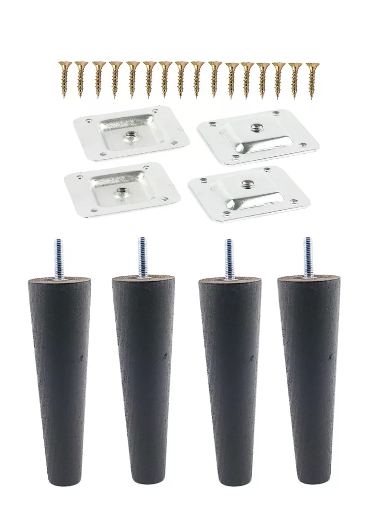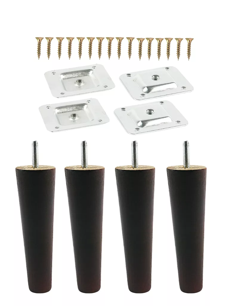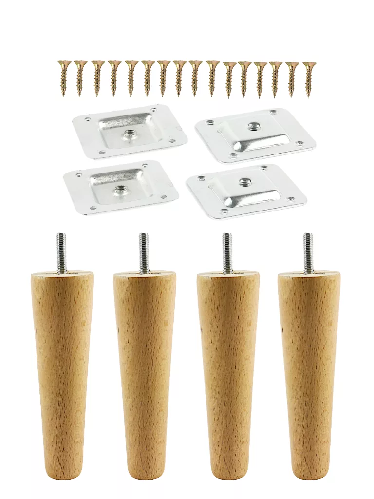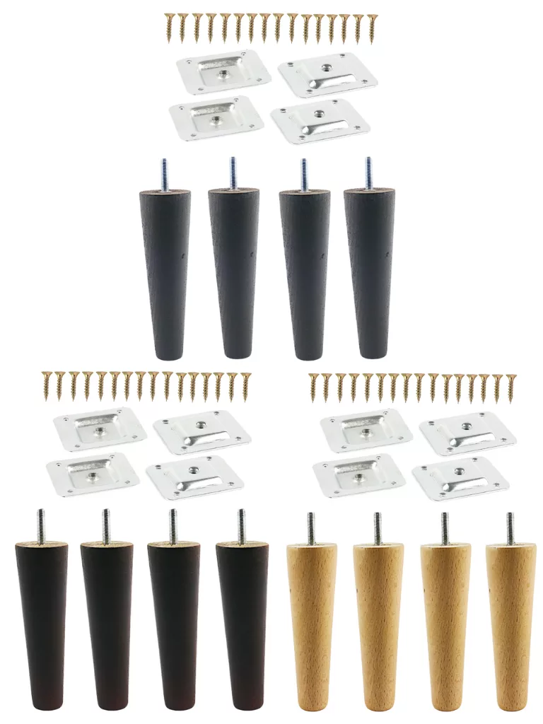 Zestaw czterech drewnianych nóg stożkowych do mebli o wysokości 15 cm pozwala nadać meblom elegancki wygląd i stabilne podparcie. W komplecie znajdują się blachy montażowe oraz wkręty, dzięki czemu montaż jest szybki i bezproblemowy. Nogi dostępne w trzech wariantach kolorystycznych, dzięki czemu sprawdzą się w różnych aranżacjach wnętrz, od klasycznych po nowoczesne.