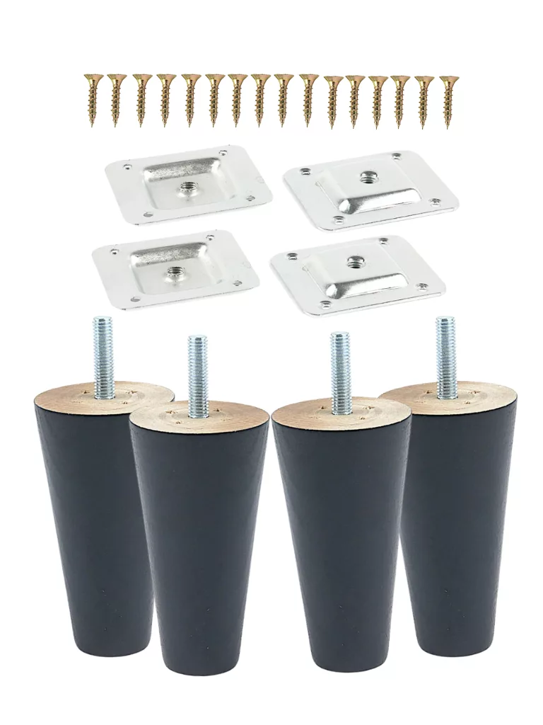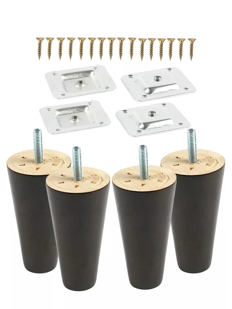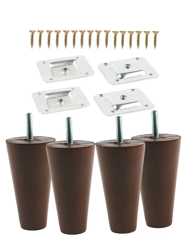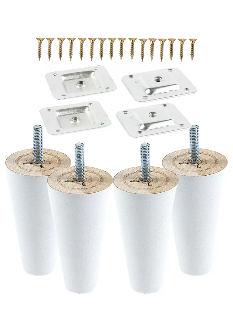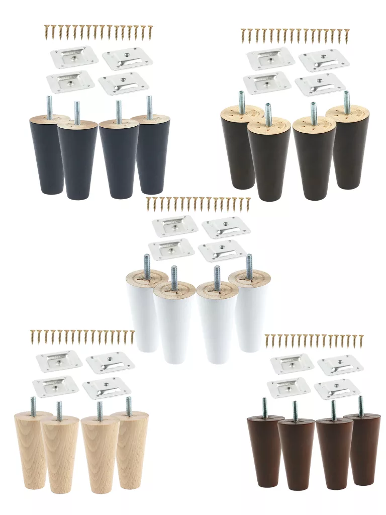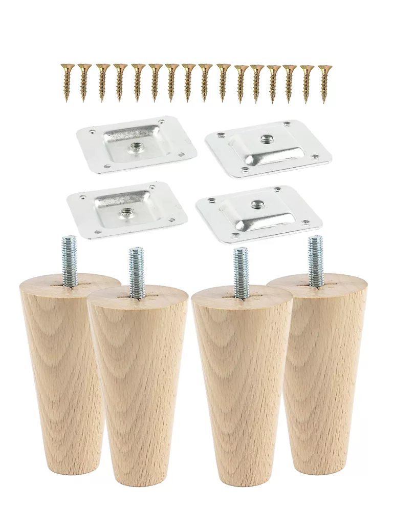 Komplet zawiera wszystkie elementy niezbędne do montażu, dzięki czemu instalacja przebiega szybko i wygodnie. Stożkowy kształt drewnianych nóg łączy prostotę z elegancją, a wzmocnione mocowanie i hartowane wkręty gwarantują trwałość oraz stabilność konstrukcji. Zestaw nadaje się zarówno do nowych projektów, jak i do renowacji starszych mebli.